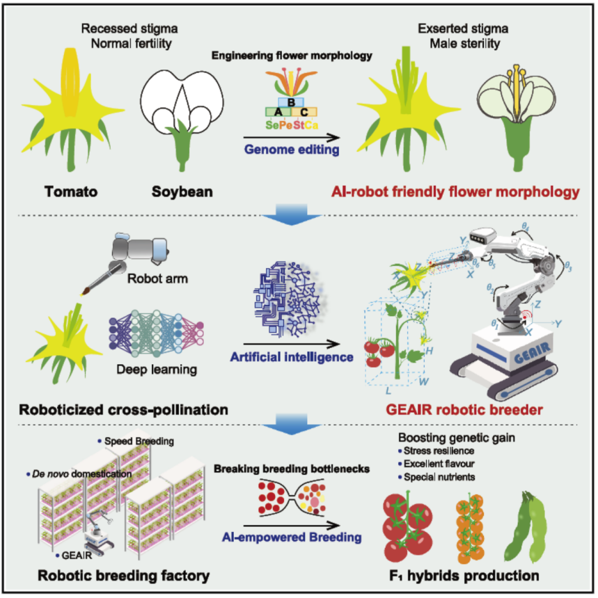 The Institute of Automation, Chinese Academy of Sciences, and the Institute of Genetics and Developmental Biology, Chinese Academy of Sciences, have jointly developed a fully automated method and robotic system aimed at accelerating breeding/seed production processes in modern greenhouse crops. On August 11, the related research paper, entitled Engineering tomato floral morphology facilitates robotization of cross-pollination and speed breeding, was published online in Cell. This research represents a deep integration of artificial intelligence, robotics, and modern breeding industry, opening up an intelligent breeding (BAR) model of “Biological Technology (BT) foundation + AI empowerment + robotic labor (Robot),” breaking through the bottlenecks of traditional hybrid breeding and seed production, significantly reducing breeding costs, shortening breeding cycles, and improving breeding efficiency. This research marks that China has taken the lead in completing the construction of a closed-loop technology system for intelligent robot breeding, demonstrating the major application prospects of “AI for Science” in innovating biological breeding paradigms and fostering new productive forces.
