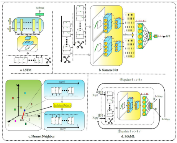 Siamese Networks are classic metric-based few-shot learning methods. Since standard Siamese Networks cannot handle neuromorphic data, the team adapted them with LIF-based SNN backbones to add temporal processing capability. Siamese Networks take two inputs, label pairs as 1 if they belong to the same class and 0 otherwise, and learn to compare features. As shown in Figure b, the network’s first half is shared between inputs, with the difference of their feature maps fed to a final fully connected layer. During testing, each query is compared to all support samples, and the class with the highest predicted probability is selected.