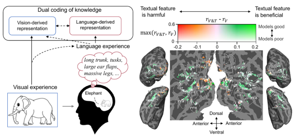 Figure 1. Dual encoding of knowledge in the human brain. When we see a picture of an elephant, we naturally retrieve related knowledge in our minds (such as its long trunk, tusks, and large ears). At this moment, the concept of the elephant is encoded in the brain both visually and linguistically, with language serving as an effective form of prior experience that helps shape the representations produced by vision.