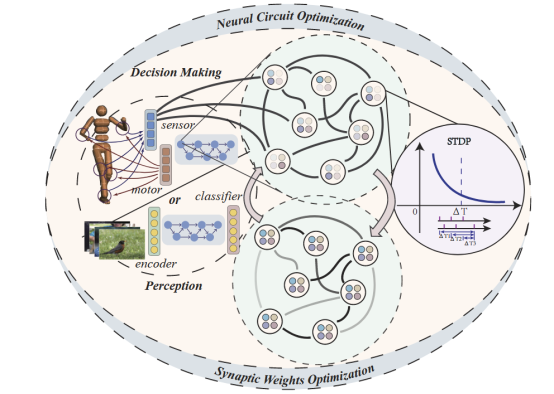 Different types of neural circuits and their adaptive capabilities in the human brain enable complex cognitive functions such as perception, learning, and decision-making. Most current SNN architectures still borrow heavily from traditional deep learning designs without fully incorporating the brain’s adaptive structural mechanisms. To address this, the BrainCog team integrates excitatory and inhibitory neurons and feedforward-feedback connections with local unsupervised learning rules and structural evolution mechanisms to generate biologically plausible circuit structures. By combining these with global error signals, the evolved brain-inspired SNNs show significantly enhanced abilities in perception, reinforcement learning, and decision-making. Related work, Brain-inspired neural circuit evolution for spiking neural networks, was published in Proceedings of the National Academy of Sciences (PNAS).