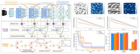 Integrating biological brain mechanisms such as dendritic spine plasticity, local synaptic plasticity, and activity-dependent spiking traces, the team designed an adaptive pruning strategy based on the “use it or lose it” principle to remove redundant synapses and neurons. This approach explores how developmental plasticity can enable dynamic structural adjustment in neural networks, allowing them to “develop” into more efficient structures like biological brains. Their general developmental plasticity–inspired adaptive pruning method significantly improves performance and efficiency in both deep neural networks and SNNs. Related work, Developmental Plasticity-inspired Adaptive Pruning for Deep Spiking and Artificial Neural Networks, was published in IEEE Transactions on Pattern Analysis and Machine Intelligence (IEEE TPAMI).