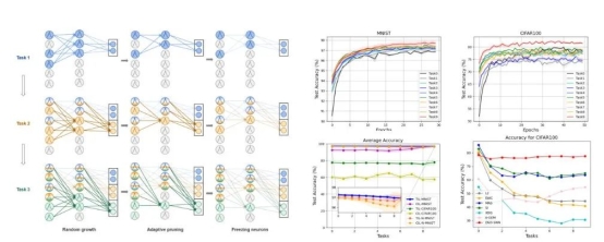 Inspired by the brain’s dynamic expansion and pruning of neural pathways, the BrainCog team proposed a continual learning algorithm for SNNs with dynamic structural development. This model can grow, prune, and share neurons over time to reuse knowledge from previous tasks, improving continual learning performance while increasing memory capacity and reducing computation costs. Related work, Enhancing Efficient Continual Learning with Dynamic Structure Development of Spiking Neural Networks, was presented at IJCAI 2023.