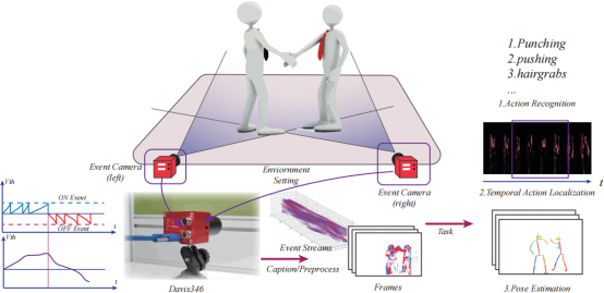 Public surveillance cameras have played a positive role in reducing violent incidents but have also raised privacy concerns. To address this, the BrainCog team leveraged the characteristics of DVS cameras to create the Bullying10K neuromorphic dataset. The dataset contains 10,000 event clips totaling 12 billion events and 255GB of data. Unlike conventional cameras, DVS cameras generate event streams by detecting pixel-level brightness changes, making content recognition more difficult. Bullying10K emphasizes capturing complex, fast, and potentially occluded actions while preserving participant privacy. This approach enables violence detection while ensuring privacy protection. The team hopes this dataset will provide valuable data for future research in the field and open up new opportunities for data protection methods. Related work, Bullying10K: a large-scale neuromorphic dataset towards privacy-preserving bullying recognition, was published at Advances in Neural Information Processing Systems 2024 (NeurIPS 2024).