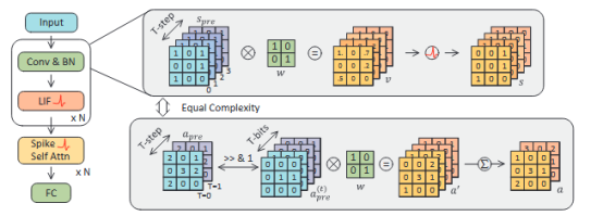 The BrainCog team re-examines the energy efficiency advantage of SNNs from the perspective of network quantization, exploring how to fairly compare them with quantized artificial neural networks (ANNs). They propose a unified perspective that draws an analogy between time steps in SNNs and activation bit widths in ANNs, and introduce a more practical, reasonable method for estimating SNN energy consumption. Unlike traditional SynOps metrics, they introduce the concept of a “Bit Budget” to explore how to reasonably allocate computation and storage resources among weights, activations, and time steps under strict hardware constraints. Guided by this bit budget, the study shows that focusing on spike patterns and weight quantization, rather than merely reducing time steps, has a more profound impact on model performance. Optimizing SNN design under the bit budget framework significantly improves performance on static image and neuromorphic datasets, bridging the theoretical gap between SNNs and quantized ANNs and offering a practical path to achieving higher energy efficiency in neural computing. Related work, Are Conventional SNNs Really Efficient? A Perspective from Network Quantization, was published at IEEE/CVF Conference on Computer Vision and Pattern Recognition 2024 (CVPR24).
