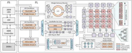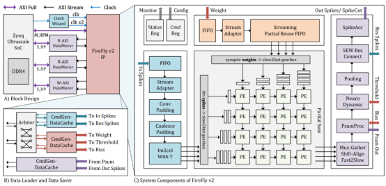 BrainCog FireFly-v2 is an advanced brain-inspired SNN accelerator that evolves alongside algorithms. It introduces bit-decomposition mechanisms to handle multi-bit spike-unfriendly operations from a hardware perspective. The design optimizes the dataflow model, resolving timing dependencies to eliminate expensive on-chip membrane potential storage. By introducing double clock frequency technology, it doubles the operation unit frequency, achieving 40% higher utilization compared to existing FPGA-based SNN accelerators like DeepFire2, with significant performance improvements over the first generation. Related work, FireFly v2: Advancing Hardware Support for High-Performance Spiking Neural Network with a Spatiotemporal FPGA Accelerator, was published in IEEE Transactions on Computer-Aided Design of Integrated Circuits and Systems (TCAD).