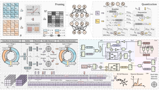 BrainCog FireFly-S introduces dual-side sparsity acceleration with software-hardware co-design. At the algorithm level, it innovates a hardware-friendly learning rate quantization strategy tailored to SNN neuron characteristics, combined with a gradient rewiring-based pruning mechanism to produce highly compressed models with sparsity in both weights and neuron spikes. At the hardware level, it optimizes spatial architecture dataflow and introduces dual-side sparsity acceleration units to reduce inter-layer pipeline stalls and eliminate redundant zero-value computations, improving inference speed. Compared to earlier dense-computation FireFly versions, FireFly-S achieves 6x–20x better energy efficiency and nearly 2x efficiency compared to single-side sparse accelerators like SyncNN on smaller hardware platforms. Related work, FireFly-S: Exploiting Dual-Side Sparsity for Spiking Neural Networks Acceleration With Reconfigurable Spatial Architecture, was published in IEEE Transactions on Circuits and Systems I: Regular Papers (TCAS-I).