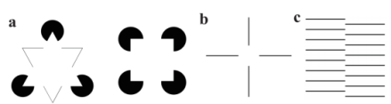 Figure 1. Classic illusory contour images in psychology. a. Kanizsa triangle and square; b. Ehrenstein illusion; c. Abutting grating illusion.