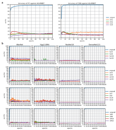 Yi Zeng’s group proposed a method called Abutting Grating Distortion as a systematic way to generate large-scale illusory contour images from silhouette images without internal texture information. The team applied this method to the MNIST handwritten digits dataset and to silhouette images of objects (16-class ImageNet silhouettes), interpolating images to enhance clarity and create stronger illusory effects for human perception. Examples are shown in Figure 2. These test images allow direct testing of deep learning models trained on MNIST or ImageNet without needing to retrain the models. Because different parameter settings produce illusions of varying strengths, the study also conducted human experiments to examine how different distortions affect human perception of illusory contours.
