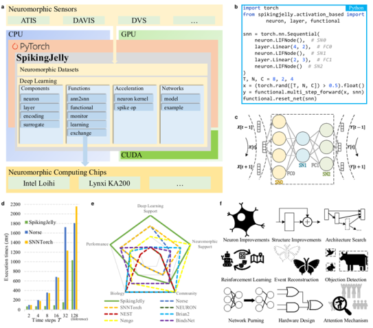 Figure 2. Structure,example code,simulation speed,ecosystem,and typical applications of the SpikingJelly framework