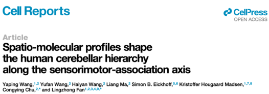 Yaping Wang, Yufan Wang, Haiyan Wang, Liang Ma, Simon B. Eickhoff, Kristoffer Hougaard Madsen, Congying Chu*, and Lingzhong Fan*. (2024). Spatio-Molecular Profiles Shape the Human Cerebellar Hierarchy Along the Sensorimotor Association Axis, Cell Reports. 43(2), 113770, 2024. DOI: https://doi.org/10.1016/j.celrep.2024.113770