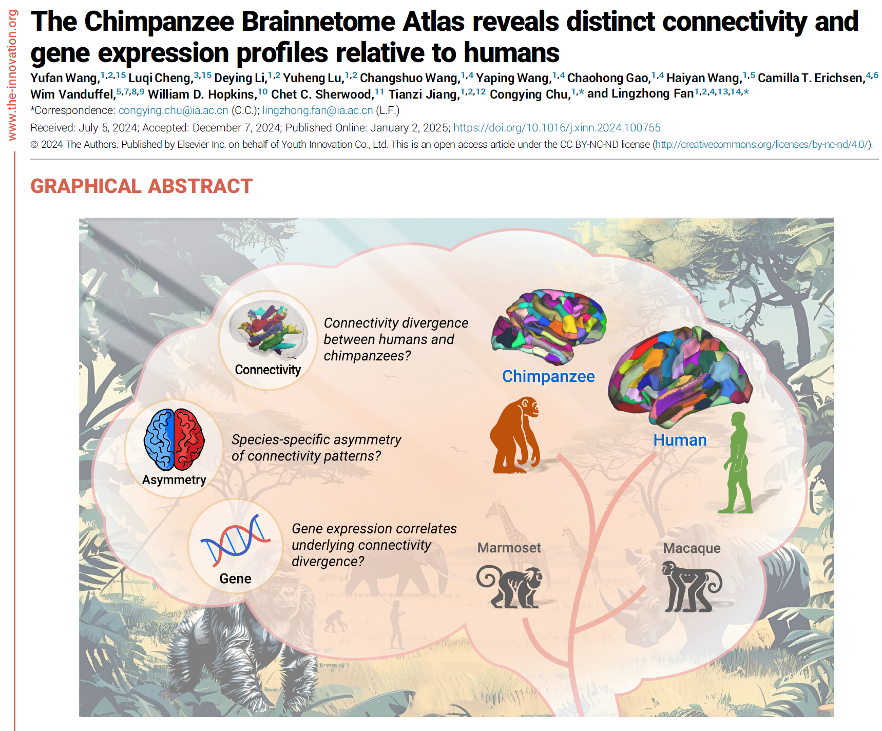 Yufan Wang, Luqi Cheng, Deying Li, Yuheng Lu, Changshuo Wang, Yaping Wang, Chaohong Gao, Haiyan Wang, Camilla T. Erichsen, Wim Vanduffel, William D. Hopkins, Chet C. Sherwood, Tianzi Jiang, Congying Chu, Lingzhong Fan. The Chimpanzee Brainnetome Atlas reveals distinct connectivity and gene expression profiles relative to humans, The Innovation, 2025, DOI: 10.1016/j.xinn.2024.100755.