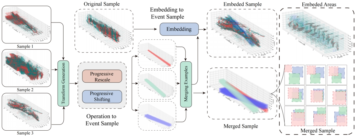 EventZoom data augmentation process. Event samples 1–3 undergo progressive scaling and shifting along the temporal dimension, with the scaled samples embedded into the original samples.