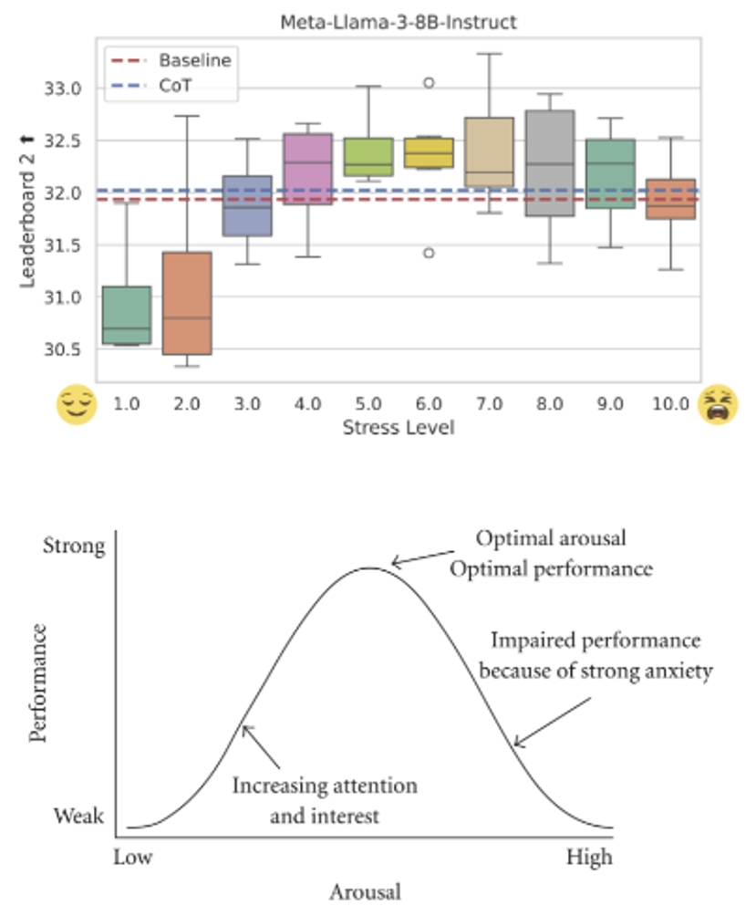 Comparison of LLM and human performance under different stress levels: (a) Leaderboard 2 benchmark performance of Llama-3-8B-Instruct under different stress levels. (b) Illustration of the Yerkes–Dodson law: human performance varies with stress level, peaking at moderate stress and declining at low or high stress. (https://en.wikipedia.org/wiki/Yerkes–Dodson_law)