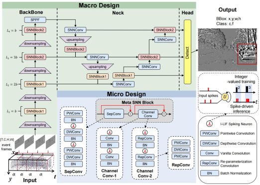 A long-standing and difficult challenge in the field of spiking neural networks (SNNs) is achieving competitive performance on large-scale, complex detection tasks. The proposed SpikeYOLO significantly bridges the performance gap between SNNs and ANNs in object detection through two main contributions. First, in terms of network architecture, the team found that overly complex architectures in SNNs lead to spike degradation, so they simplified the design (Figure 1). Second, for spiking neuron design, they proposed a new spiking neuron that uses integer-valued training and spike-driven inference, effectively reducing quantization error while preserving spike-driven computation characteristics (Figure 2). Experimental results show that this approach greatly improves task performance while maintaining low power consumption. On the static COCO dataset, SpikeYOLO achieved an mAP of 48.9%, 18.7% higher than the previous SOTA in the SNN field. On the neuromorphic Gen1 dataset, SpikeYOLO outperformed an ANN of the same architecture by 2.7% mAP with 5.7x better energy efficiency.