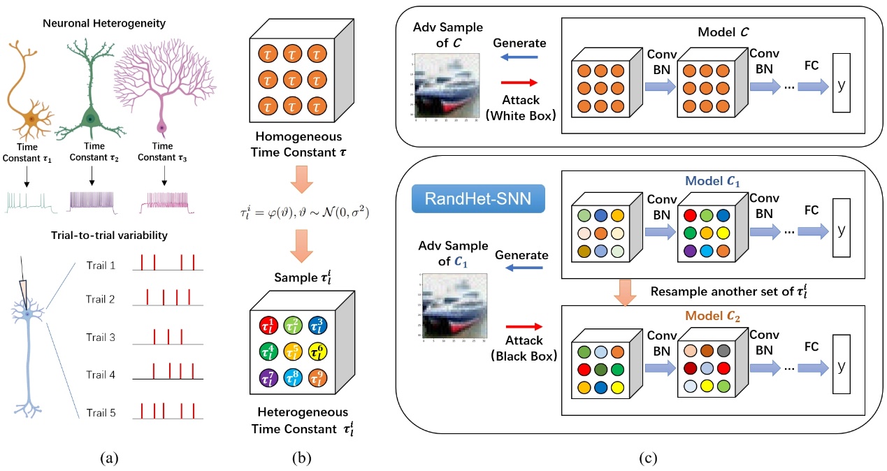 “This research introduces both randomness and heterogeneity into SNNs via randomized time constants. Different sampling in each trial leads to trial-to-trial variability in spiking patterns. By tuning sampling variance,RandHet-SNN controls the heterogeneity of time constant distributions. Our rigorous EOT-based evaluation confirms RandHet-SNN’s ability to enhance adversarial defense capabilities.”