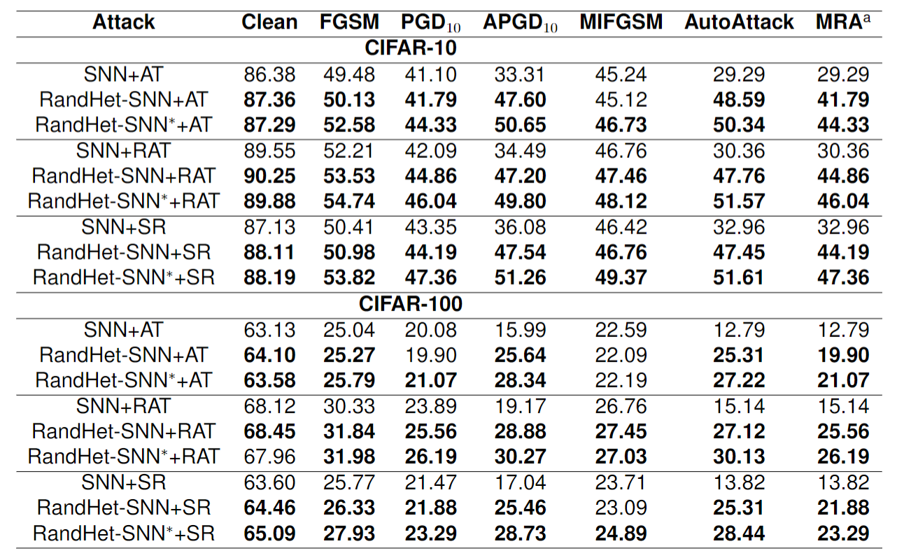 The study validated RandHet-SNN’s adversarial robustness against multiple attack methods. Results showed both RandHet-SNN and RandHet-SNN* combined effectively with various adversarial training techniques,substantially improving robustness across different attack types. Crucially,RandHet-SNN achieved this with minimal loss to clean accuracy.
