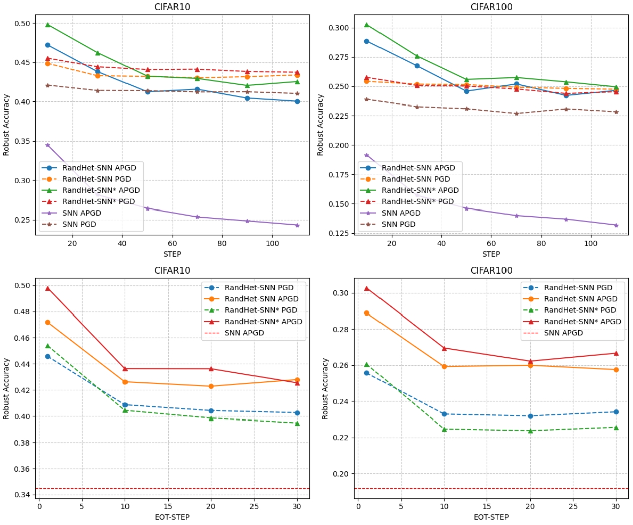 To rigorously evaluate adversarial robustness,the study carefully addressed gradient obfuscation when generating white-box adversarial samples. It used the Expectation Over Transformation (EOT) method during each attack iteration to obtain more precise gradient estimates. Results indicated that as EOT steps exceeded 10,RandHet-SNN’s robust accuracy stabilized and consistently outperformed the SNN baseline.