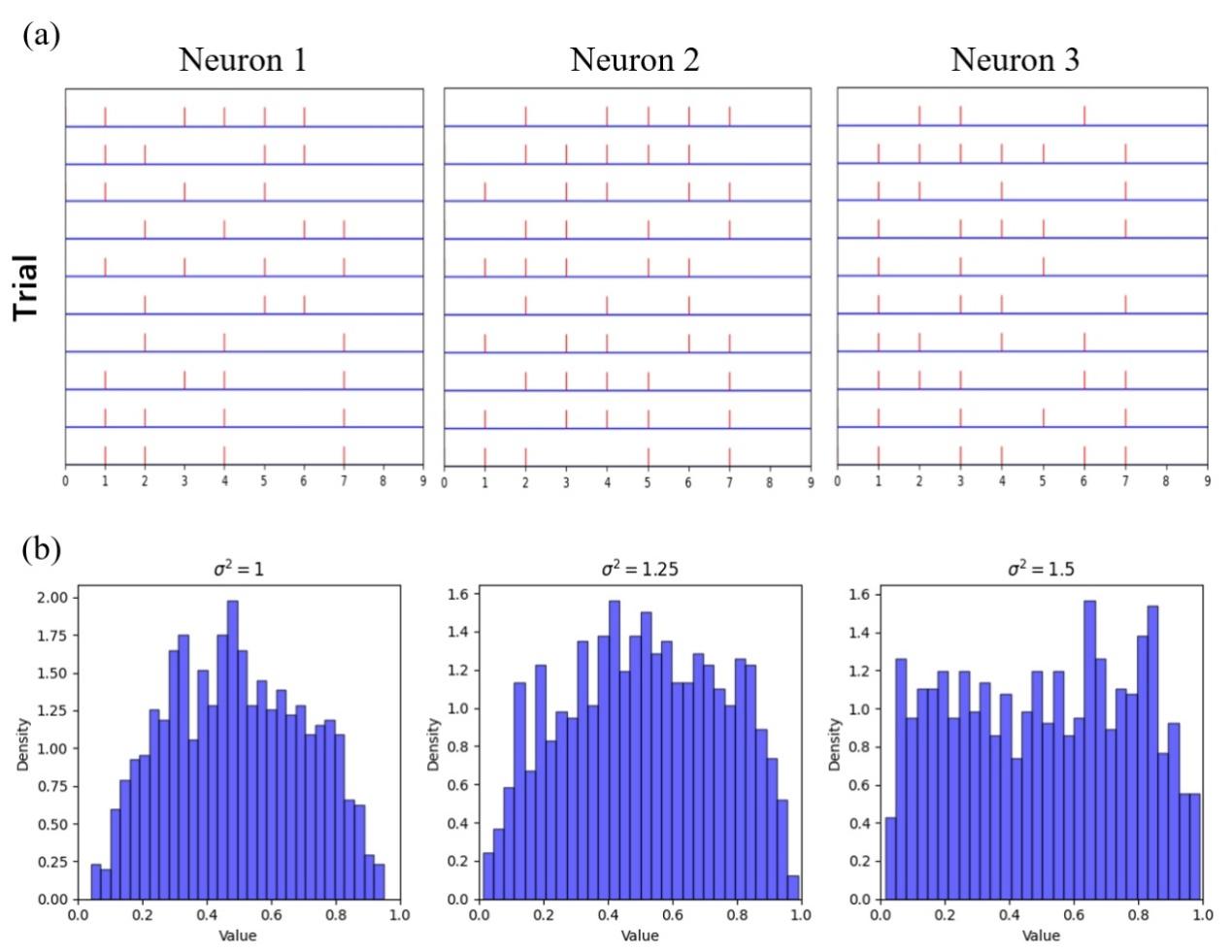 Figure 6. Illustration of trial-to-trial variability in spiking patterns and time constant distribution under different variances.