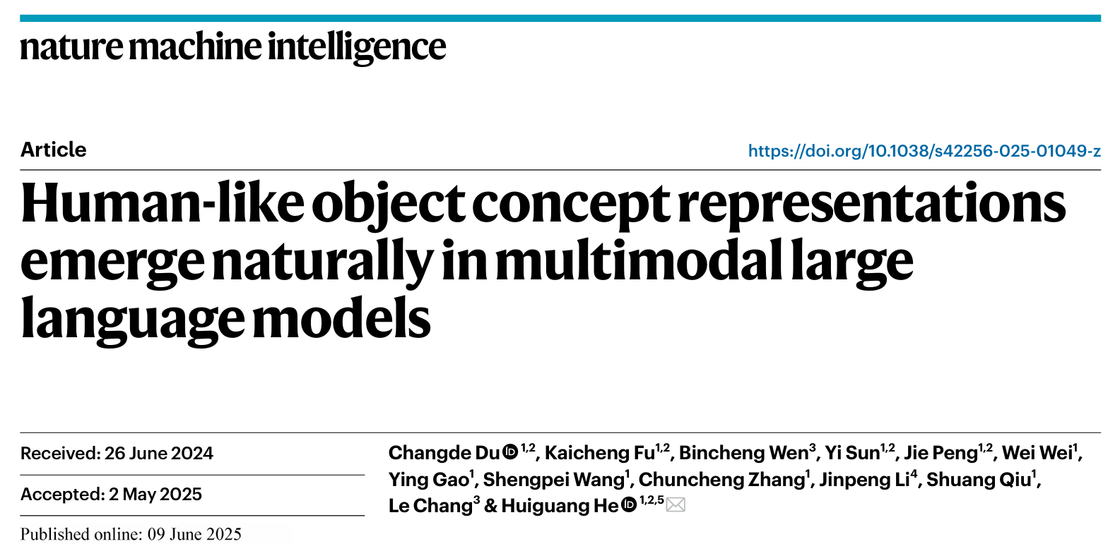 Changde Du,Kaicheng Fu,Bincheng Wen,Yi Sun,Jie Peng,Wei Wei,Ying Gao,Shengpei Wang,Chuncheng Zhang,Jinpeng Li,Shuang Qiu,Le Chang,Huiguang He. Human-like object concept representations emerge naturally in multimodal large language models. Nature Machine Intelligence (2025).