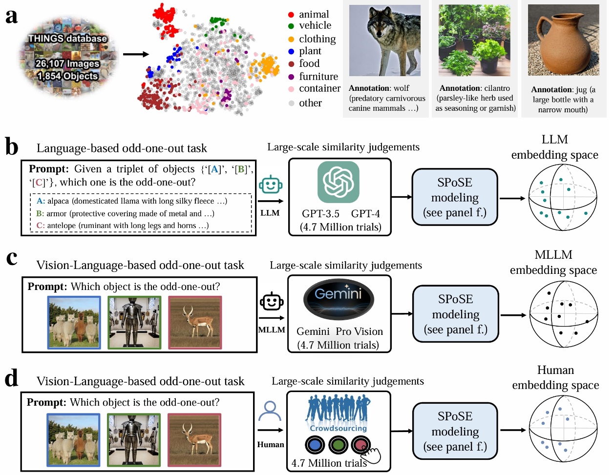 Humans have the remarkable ability to conceptualize objects in the natural world—a cognitive capability long regarded as central to human intelligence. When we see a “dog,” “car,” or “apple,” we not only recognize their physical features (size, color, shape) but also understand their functions, emotional value, and cultural significance. This multidimensional conceptual representation forms the foundation of human cognition. With the explosive growth of large language models (LLMs) such as ChatGPT, a fundamental question has emerged: can these models develop human-like object concept representations from language and multimodal data?