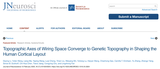 Recently, a team from the Laboratory of Brain Atlas and Brain-Inspired Intelligence at the Institute of Automation, Chinese Academy of Sciences, revealed the intrinsic relationship between the topological structure of human cortical connectivity and genetic features. The study proposes that given the vast difference in the numbers of genes and connections, the relationship between genetic encoding and interregional connectivity is not a simple one-to-one mapping. Instead, it follows a more efficient organizational principle in which genes adopt specific embedded patterns across the cortex to guide the spatial wiring of white matter tracts. By integrating human connectomics and genetic data, the team identified three principal topographic axes of brain connectivity—the dorsoventral axis, anteroposterior axis, and mediolateral axis. These axes not only reflect systematic variations in intracortical connectivity but also closely align with morphogenetic and genetic gradients during embryonic development. The study, titled Topographic Axes of Wiring Space Converge to Genetic Topography in Shaping Human Cortical Layout, was published as a Featured Article in the Journal of Neuroscience and highlighted in the “This Week in The Journal” section.
