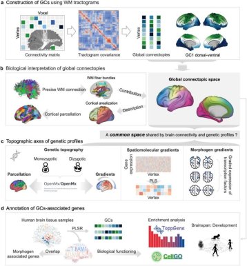This finding suggests that low-dimensional topographic representations of anatomical connectivity can unify the interpretation of genetic information and connectional organization, offering a new perspective on brain organization. The results not only deepen our understanding of functional parcellation and the genetic basis of brain organization and function but also provide a new theoretical framework for exploring cortical regionalization, functional integration, and neural circuit formation. Moreover, by identifying key genes linked to connectivity patterns and their functions, this research provides new leads for investigating the genetic mechanisms behind neurodevelopmental disorders and brain diseases.