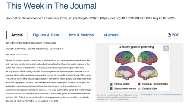 After publication, the paper was selected as a “This Week in the Journal” Featured Article in theJournal of Neuroscience and received special coverage. The feature noted that the work reveals the genetic basis of cortical connectivity heterogeneity and provides valuable insights for neuroscience research. During peer review, the study also received high praise from reviewers. One reviewer commented: “Their groundbreaking findings reveal a genetically orchestrated space that encodes the intricate variation in interareal connectivity, providing profound new insights into the complexities of cortical connections and the process of arealization.” Another reviewer noted: “This is timely work and an important contribution to the field that explores the relationship between underlying genetic gradients and macroscale anatomical wiring.”