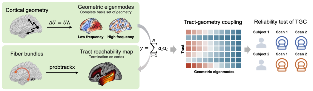 To quantify this coupling, the team used high-resolution multimodal magnetic resonance imaging (MRI) data to characterize cortical geometry and white matter fiber bundles. For cortical geometry, they derived a series of geometric eigenmodes at different frequencies through mathematical decomposition. This complete basis set can describe patterns of cortical connectivity and activation under both task-induced and resting states. For fiber tracts, they used diffusion MRI to map probability distributions of 36 major white matter fiber bundles terminating on the cortical surface, thereby representing cortical projection patterns. Results showed that cortical geometric eigenmodes could highly accurately reconstruct termination distributions of fiber bundles, much like terrain determines river flow. They termed this quantitatively characterized relationship “Tract-Geometry Coupling (TGC).” TGC is highly stable across repeated measurements and can serve as a “fingerprint” to distinguish and identify individuals.