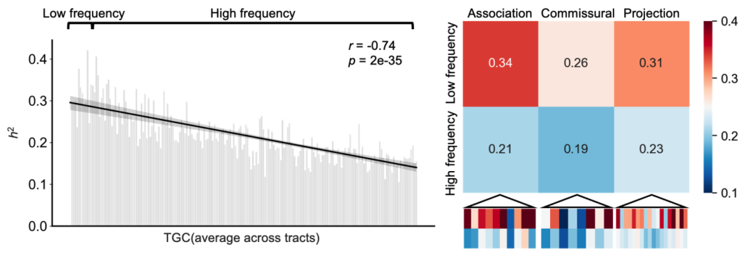 Further analysis of TGC revealed different roles of geometric eigenmodes at different frequencies. Low-frequency eigenmodes represent large-scale, smooth morphological structures, strongly influenced by genetics; high-frequency eigenmodes capture finer, localized structures, often shaped by environmental factors such as life experiences and learning. This suggests that human brain structure not only follows an innate blueprint but is also continuously shaped by experience throughout life. Moreover, the study found that projection fiber tracts showed higher heritability in their coupling with cortical geometry, consistent with their conserved roles in individual development and evolution.
